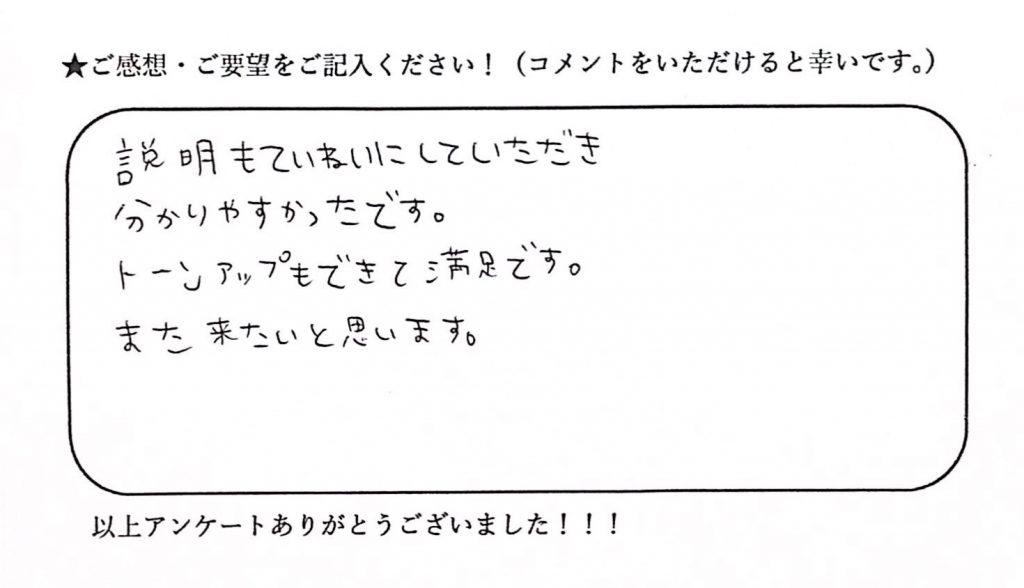 説明もていねいにしていただき 分かりやすかったです。 トーンアップもできて満足です。 また来たいと思います。