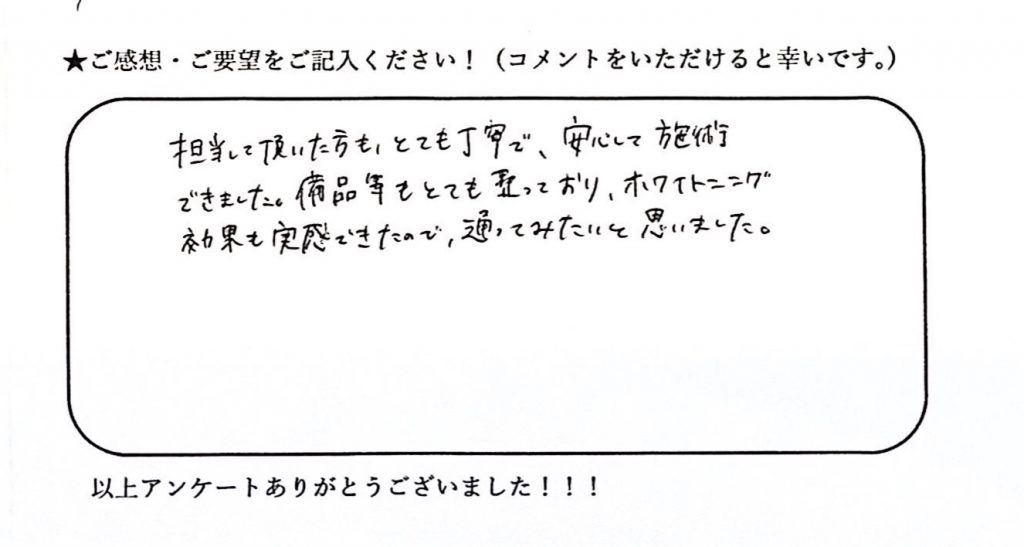 担当して頂いた方も、とても丁寧で、安心して施術できました。 備品等もとても整っており、ホワイトニング効果も 実感できたので、通ってみたいと思いました。